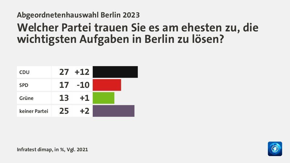 Die Kompetenzwerte der SPD in Berlin sind gegenüber der letzten Wahl dramatisch gefallen (minus 10 auf 17%)